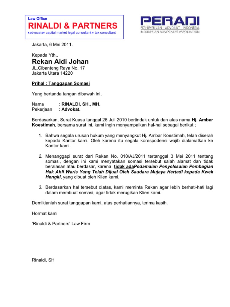 Membuat somasi tidak boleh sembarangan dan harus disertakan dengan nomor surat atau tembusan maupun kop.